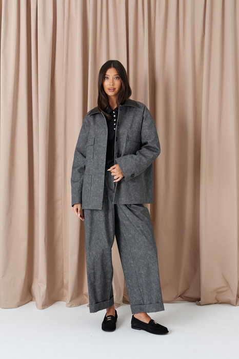 Жакет прямого кроя выполнен из ткани графитового цвета. Характеристики: прямой крой, брендированный подклад (стеганный и утепленный), остроугольный воротник из эко-кожи, застежка центральная на петли пуговицы, по передней части изделия накладные карманы, рукав спущенный, втачной, низ рукава - манжета на пуговице. Длина жакета по спинке 70 см, длина рукава от края горловины 77 см