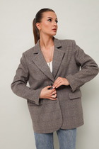 Жакет уороченный прямого кроя, выполнен из твидовой ткани бежево-розового цвета. Характеристика: прямой крой, овальная горловины, центральная застежка на петли-пуговицы, спереди изделия имитация карманов, подклад. Длина рукава от края горловины 73см. Длинаизделия по центру спинки 51см.