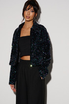 Жакет прямого свободного кроя выполнен из костюмной ткани черного цвета. Характеристики: прямой свободный крой, брендированная подкладка, подплечники, воротник с остроугольным лацканом, застежка центральная на петлю - пуговицу, по переду функциональные карманы с клапаном, рукав к низу расклешен, втачной, чуть спущен, по низу рукава нашиты пуговички, спинка цельнокроеная. Длина по спинке 77, длина рукава от края горловины 84 см.