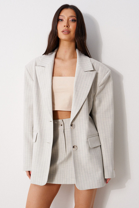 Жакет прямого кроя, выполнен из костюмной ткани светло-серого цвета в узку полоску. Характеристика: прямой свободный крой, воротник с остроугольным лацканом, застежка центральная на пуговицы, брендированный подклад, спереди прорези для функцинальных карманов с клапанами, плечо спушенное, рукав свободный, с декоративными пуговицами, в центральном шве по спинке разрез 25 см. Длина плеча 19 см, длина рукава от места втачивания 64см. Длина изделия по центральному шву по спинке 76 см.
