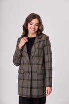 Жакет прямого свободного кроя, выполнен из костюмной ткани черного цвета. Характеристика: V-образный вырез горловины, отложной воротник, застежка центральная на две петли пуговицы, функциональные карманы с клапанами, брендированная подкладка, широкое плечо, подплечники, рукав втачной, на манжете функциональные пуговицы, в среднем шве заднего полотна изделия шлица 51 см. Длина изделия по центральному щву по спине 118 см, длина рукава от края горловины 84 см.