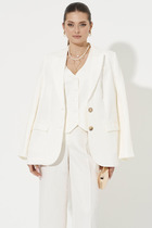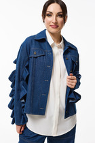 Жакет однобортный, на подкладке, выполнен из эко-кожи. Обработан молнией разъёмной молнией по центру переда, закрывающейся планкой с пуговицами. Воротник тложнй, рубашечного типа. Рукава втачные одношвные, прямые. По передним половинкам обрабтаны накладные карманы с клапаном.