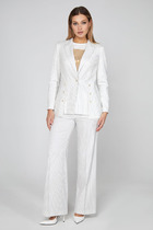 Жакет женский удлиненный, из текстильной ткани, на подкладке, полуприлегающего силуэта с центральной бортовой застежкой на пуговицы до линии перегиба лацкана. Спереди рельефные швы от плечевого шва, отрезной бочок и карман с клапаном. Спинка с рельефами от плечевого шва. Рукав втачной, двухшовный, по низу рукава обработана шлица на петли-пуговицы. Воротник пиджачного типа. Длина по спинке 66 см, длина рукава 62 см. К жакету рекомендуем брюки 596-арт. 2 79 22 и блузу 479.
