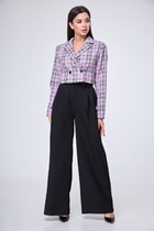 Жакет женский удлиненный, из текстильной ткани, на подкладке, полуприлегающего силуэта с центральной бортовой застежкой на пуговицы до линии перегиба лацкана. Спереди рельефные швы от плечевого шва, отрезной бочок и карман с клапаном. Спинка с рельефами от плечевого шва. Рукав втачной, двухшовный. Воротник пиджачного типа. Длина по спинке 66 см, длина рукава 62 см.