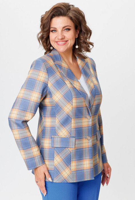 Жакет женский удлиненный, из текстильной ткани, на подкладке, полуприлегающего силуэта с центральной бортовой застежкой на пуговицы до линии перегиба лацкана. Спереди рельефные швы от плечевого шва, отрезной бочок и карман с клапаном. Спинка с рельефами от плечевого шва. Рукав втачной, двухшовный. Воротник пиджачного типа. Длина по спинке 67 см, длина рукава 62 см.