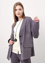 Жакет женский удлиненный, полуприлегающего силуэта с центральной бортовой застежкой на пуговицы до линии перегиба лацкана. Спереди рельефные швы от плечевого шва, отрезной бочок и карман с клапаном. Спинка с рельефами от плечевого шва. Рукав втачной, двухшовный, 3/4, с небольшим разрезом в локтевом шве. Воротник пиджачного типа. Перед жакета на подкладке. Длина рукава 50, длина по спинке 68 см.