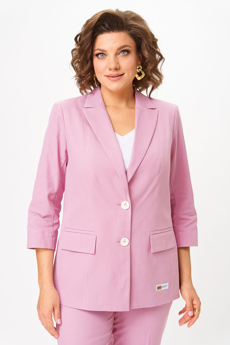 Жакет женский удлиненный, полуприлегающего силуэта с центральной бортовой застежкой на пуговицы до линии перегиба лацкана. Спереди рельефные швы от плечевого шва, отрезной бочок и карман с клапаном. Спинка с рельефами от плечевого шва. Рукав втачной, двухшовный, 3/4, с небольшим разрезом в локтевом шве. Воротник пиджачного типа. Перед жакета на подкладке. Длина рукава 50, длина по спинке 68 см.
