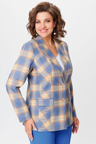 Женский жакет-блуза, прямого силуэта, из хлопковой ткани. Горловина округлой формы, застежка центральная на притачную планку, застегивается на металличесские кнопки. В отрезной части переда обработаны карманы. Спинка цельная. Низ фигурный. В боковых швах разрезы. Рукав втачной, двухшовный, с притачной манжетой, 3/4. Изделие без подкладки. По швам проложены отделочные строчки. Длина рукава 46 см, длина по спинке 86 см.