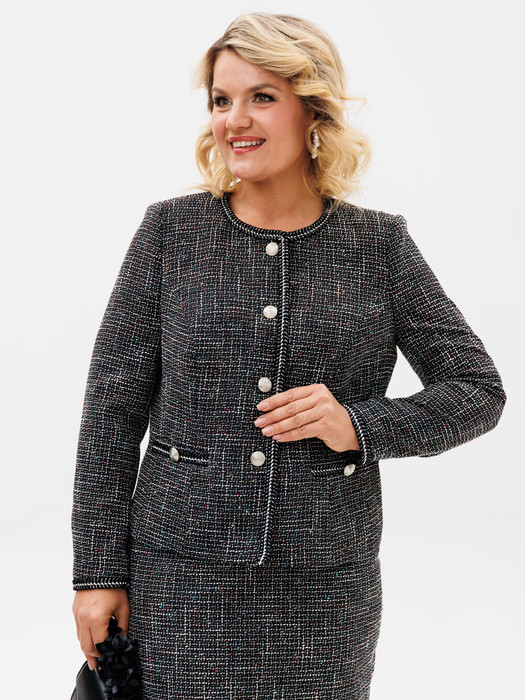 Жакет в стиле шанель – находка для вашего гардероба. Он выполнен в классическом стиле и подойдет под любого дресс-код. В нем уместно отправиться в офис, на мероприятие, ужин с партнерами. Жакета с длинным рукавом на пуговицах , с прорезными карманами. Декоратианая тесьма по горовине, центральной застежке, низу рукава и планках.  Жакет большого размера хорошо садится по фигуре, визуально корректируя мелкие недостатки за счет расцветки.
