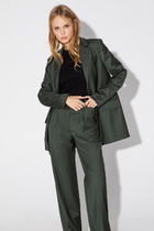 Жакет полуприлегающего силуэта, застежка на петли пуговицы, с V- образным вырезом горловины, горловина плавно переходящая в стойку. По переду и спинке рельефные швы, которые делают отличную посадку по фигуре. Также по переду расположены боковые карманы, клапаны. Жакет с ассиметричной линией низа.