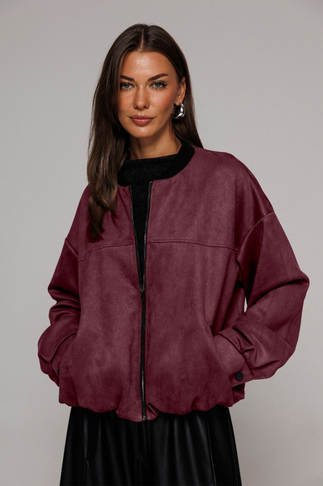 Жакет-бомбер из искусственной замши свободного силуэта со спущенной линией плеча. Рукав втачной двухшовнный, внизу со складками, притачной манжетой с застежкой на кнопку. Полочка с застежкой на тесьму молнию, с кокеткой и карманами с застежкой на молнию. Синка с кокеткой. По горловине планка из довяза. Низ жакета-бомбера со сборкой. Изделие на подкладке.