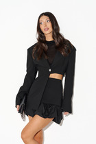 Жакет женский прямого силуэта из ткани костюмного ассортимента на подкладке. На полочке на уровне линии груди настрочены накладные карманы с клапанами, которые украшают декоративные пуговицы. Спинка разрезная. Рукав двухшовный. Горловина округлой формы. Застежка на пробивные петли и пришивные пуговицы.