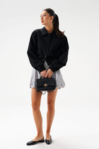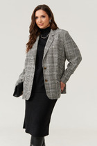 Жакет выполнен из костюмной ткани. Жакет прямого силуэта, длиной ниже линии бедер, покроя "oversize". Спереди под лацканами прорезные карманы с клапанами. Центральная бортовая застежка на пуговицы. На спинке средний шов и шлица. Воротник пиджачного типа. Плечевой шов удлинен. Рукав втачной, двухшовный, со шлицей по низу, застегивающейся на пуговицы. Жакет на притачной по низу подкладке. Ремень в комплект НЕ ВХОДИТ.