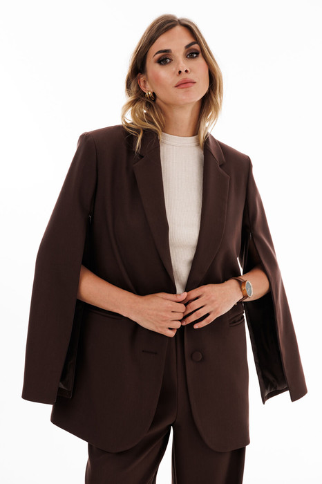 Жакет выполнен из костюмной ткани. Жакет прямого силуэта, длиной до линии бедер. Спереди застежка на пуговицы и прорезные карманы. Жакет по низу закругленной формы. На спинке средний шов. Воротник пиджачного типа. Рукав втачной, двухшовный, декорирован потайной молнией. Жакет на притачной по низу подкладке.