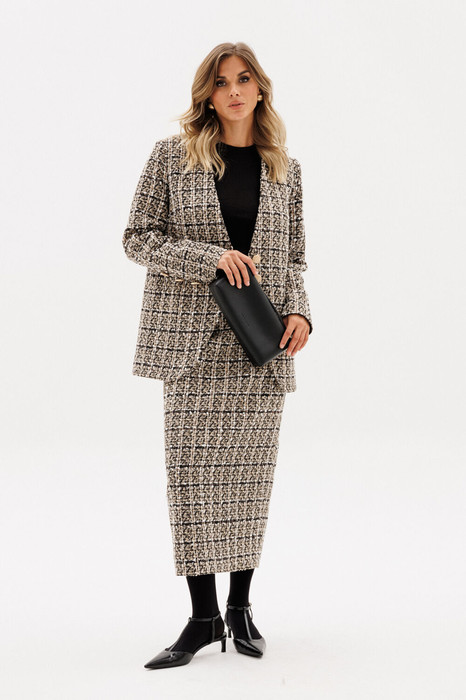 Жакет выполнен из твида. Жакет прямого силуэта, длиной до линии бедер. Спереди центральная застежка на пуговицы. Край борта фигурной формы. На спинке средний шов. Горловина V-образной формы. Рукав втачной двухшовный с декоративными пуговицами. Жакет на притачной по низу подкладке.
