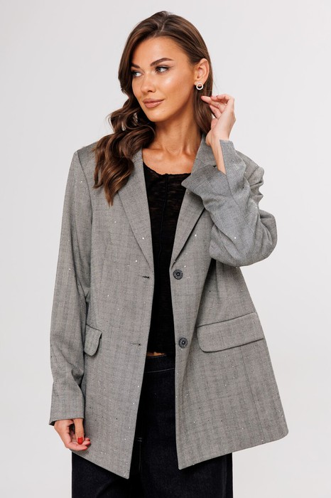 Жакет свободного расширенного силуэта, втачного покроя с центральной застёжкой и классическим английским воротником. Полочка с отрезным бочком, нагрудной вытачкой и прорезным карманом с клапаном. Спинка с центральным швом, шлицей и отрезным бочком. Рукав двухшовный с отлетной шлицей. Элегантность и нарядность жакету придает ткань в мелкую рассыпную пайетку.