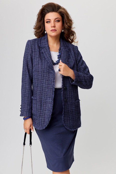 Жакет женский "Плеяна" выполнен из твидовой ткани с блестящей нитью. Жакет на подкладке полуприлегающего силуэта, воротник отложной, по борту лацканы, низ борта закругленный, застежка однобортная на три пуговицы. По полочке - рельеф и накладной карман, по краю кармана трепка. Края воротника, лацканов и борта обработаны трепкой. По спинке - рельефы, рукав втачной двухшовный. Жакет нарядный отличный вариант для праздников и повседневной носки. Нарядный с легкой люрексовой ниткой добавит вам нарядности и элегантности!