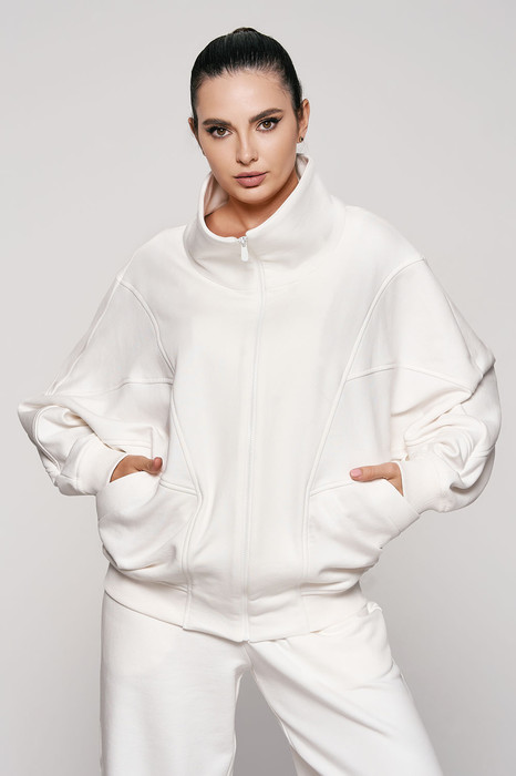 Спортивный женский бомбер свободного силуэта с рукавами "летучая мышь" и функциональными карманами по переду застегивается на молнию. Бомбер выполнен из высококачественного футера 3-х нитки класса "пенье". Лицевая сторона ткани гладная, изнанка - петлеобразная. Низ бомбера и рукавов выполнены из трикотажного полотна в рубчик (резинка) "кашкорсе" в тон основной ткани.