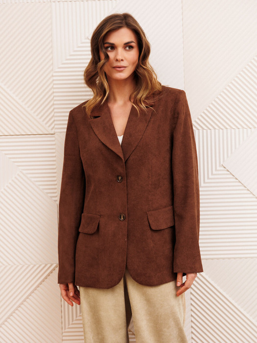 Жакет полуприлегающего силуэта из мягкой вельветовыой ткани. Застежка однобортная на две пуговицы, воротник пиджачного типа. Перед с талиевой вытачкой, рельефом и декоративным клапаном. Спинка с рельефами из проймы и средним швом. Рукав втачной двухшовный. Жакет на подкладке. Длина жакета - 68 см, длина рукава жакета - 60 см.