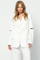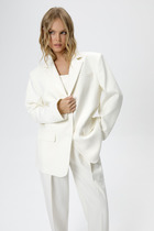 На левом лацкане вышивка-логотип в контрастном цвете. Низ и борта имеют открытые края (эффект необработанного шва), укреплены дополнительной строчкой. Жакет без подкладки.