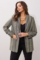 Жакет с центральной застежкой на петли и пуговицы, без воротника, с круглым вырезом горловины. По переду с накладными карманами на уровне груди и талии, закрепленными к полочкам петлей и пуговицей, рельефами, выходящими из проймы,. По спинке со средним швом. Рукав втачной, длинный.