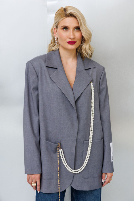 Жакет свободного кроя, на подкладке. по переду расположены накладные карманы. Застежка центральная на пуговицу. В комплекте идут жемчужные бусы. Этот жакет добавит дерзости и притягательности вашему образу.