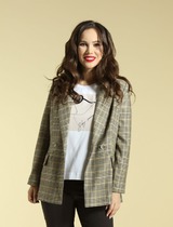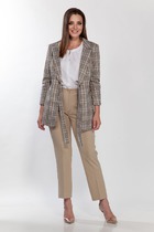 Жакет однобортный умеренного объема, приталенного силуэта. Силуэт изделия создается за счет отрезных бочков на спинке и полочке, а также за счет среднего шва и плечевых вытачек на спинке. На полочке нагрудная вытачка переведена в плечевой шов. Плечевой пояс расширен и поддерживается плечевыми накладками. Рукав втачной, длинный, двухшовный. Воротник отложной с отрезной стойкой, пиджачного типа. Застежка на уровне линии талии на одну петлю и пуговицу. Жакет полностью обработан притачной подкладкой. Длина изделия до середины бедер.