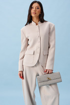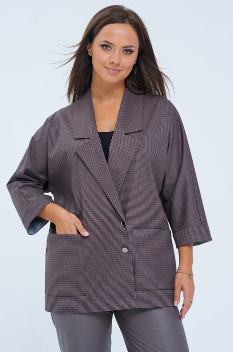 Жакет свободного кроя с укороченными рукавами и ассиметричной застёжкой на две пуговицы. По переду жакета расположены накладные карманы.