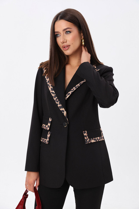 Жакет однобортный умеренного объёма приталенного силуэта с застёжкой на пуговицу. По бокам расположены функциональные прорезные карманы с клапаном. Окантовка воротника и клапанов карманов выполнена из контрастной ткани с леопардовый принтом. Рост фотомодели 175 см. Размер у фотомодели – 44.