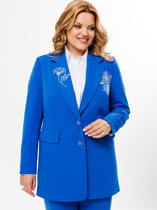 Жакет прямого силуэта с фигурным низом из трикотажного полотна. Горловина округлая, по центру застежка на кнопки. Рукав со спущенной линией плеча. По переду накладные карманы. Жакет без подкладки. Обращаем ваше внимание, что фурнитура может отличаться от фото.