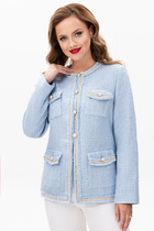 Жакет женский полуприлегающего силуэта на центральной застёжке, в области талии на потайной крючок. Перед с горизонтальными подрезами ниже линии талии, в котором выполнен карман и талиевыми вытачками от подреза. Спинка со средним швом и рельефами от проймы до низа. Горловина v-образной формы с шалевым воротником. Рукав втачной двухшовный длиной 7/8 с фиксированной драпировкой по низу. Жакет на полной подкладке.