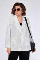 Жакет прямого силуэта на подкладке. Спинка со средним швом. На полочке нагрудная вытачка переведена в прорезной карман с клапаном и листочкой. Линия плеч расширена. Рукава втачные, длинные, двухшовные. Воротник отложной, пиджачного типа на отрезной стойке. Однобортная застежка на петли и пуговицы. Отделочные детали из трикотажного гофре по низу рукава и самого изделия создают имитацию рубашки.
