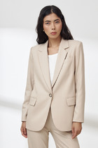 Жакет двубортный прямого силуэта свободного объёма. Изделие на подкладке. Линия плеча немного расширена. Боковой шов отсутствует, смоделирован бочок. Детали переда с двумя вытачками. Первая вытачка из горловины переда располагается под лацканом. Вторая вытачка образована за счет объединения нагрудной вытачки с талиевой. Деталь правого переда с двумя прорезными карманами с клапаном, которые располагаются один над другим. Вытачка заканчивается подрезом по линии входа нижнего кармана. На детали левого переда вытачка переведена в линию низа, заканчивается разрезом. В рельефный шов на уровне талии вставлен пояс с петлей. Рукав втачной двухшовный. Воротник английский с отрезной стойкой.