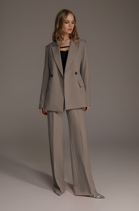 Классический приталенный жакет из текстильной ткани. Детали: жакет с отрезными бочками и нагрудными вытачками, пиджачный воротник, прорезные карманы, двубортная застежка на петли и пуговицы, спинка со средним швом, втачные двухшовные рукава, жакет на подкладке