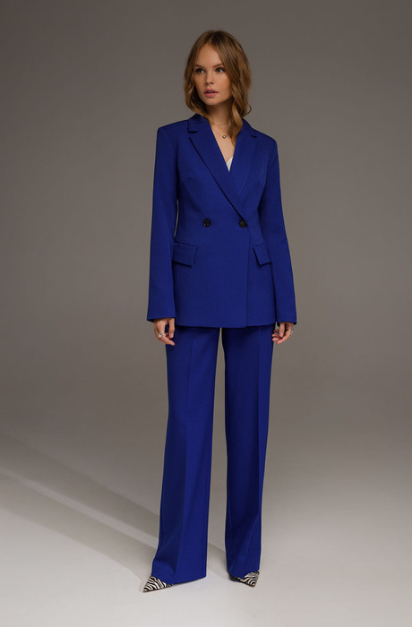 Классический приталенный жакет из текстильной ткани. Детали: жакет с отрезными бочками и нагрудными вытачками, пиджачный воротник, прорезные карманы, двубортная застежка на петли и пуговицы, спинка со средним швом, втачные двухшовные рукава, жакет на подкладке
