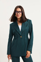 Укороченный оверсайз жакет с расширенными плечами. Детали: прямой силуэт, спущенная линия плеча, пиджачный воротник, перед с функциональным нагрудным карманом, застежка двубортная на петли и пуговицы, рукава втачные двухшовные, жакет на подкладке.