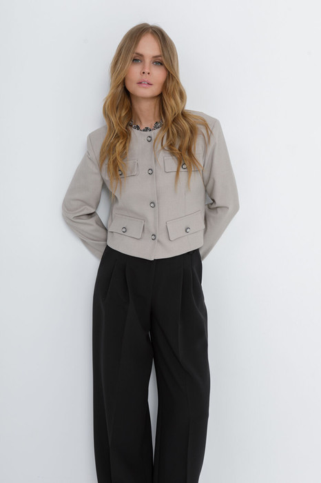 Детали: прямой силуэт, расширенная линия плеч, талиевые вытачки, круглая горловина, без воротника, рукава втачные со шлицами, имитация карманов, застежка на петли и декоративные пуговицы, на подкладке.
