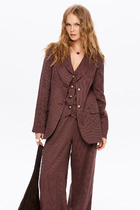 Детали: полуприлегающий силуэт, рельефы переда и спинки, пиджачный воротник, перед с отлетными деталями, застежка на петли и декоративные пуговицы, отрезная линия талии по спинке, втачные длинные рукава со шлицами, жакет на подкладке.