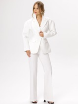Детали: жакет прямого силуэта, расширенная линия плеч, пиджачный воротник, перед с прорезными функциональными карманами, однобортная застежка на петли и пуговицы, спинка со средним швом и шлицей, рукава втачные двухшовные, на подкладке.