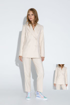 Жакет из костюмной ткани на подкладке. Жакет прямого силуэта с двубортной застежкой на 2 петли и пуговицы и одну потайную. По переду- прорезные карманы с клапанами. Воротник-с отложными лацканами пиджачного типа, двухшовные, длинные.