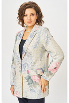 Жакет женский свободного прямого силуэта, длиной ниже линии бедер.  Жакет без подкладки со съемным поясом и накладными карманами.  По переду и горловине спинки притачная планка, без застежки. Линия плеча слегка спущена. Рукав втачной длинный с отложной манжетой. В боковых швах разрезы. Украшен жакет съемным цветком из отделочной ткани.