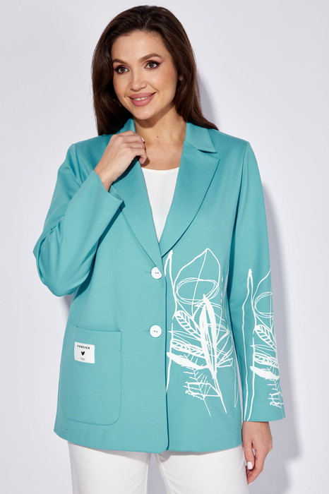 Жакет женский, облегченный, выполнен из трикотажного полотна, без подкладки, прямого силуэта с длинным втачным рукавом. Воротник пиджачного типа с лацканами. Застежка однобортная на петли и пуговицы. Левая полочка и рукав акцентированы ярким принтом. На правой полочке накладной карман с декоративной нашивкой. Спинка со средним швом.