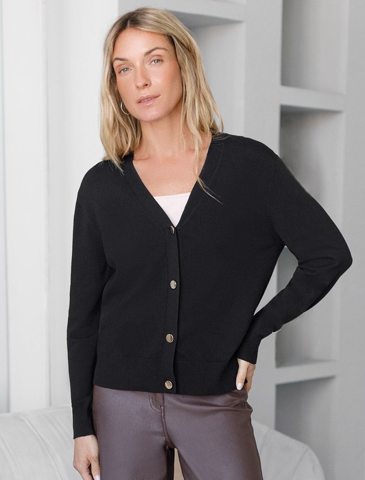 Состав: 83%Вис 17%ПА Плотность: 12 GG Параметры модели на первом фото: Рост 172, бюст 88, талия 64, бедра 88 Размер товара на первом фото: 42Жакет тонкой вязки выполнен из вискозы с нейлоном. Модель с V- вырезом дополнена золотистыми пуговицами и фирменным металлическим логотипом бренда. Мягкая пряжа приятная к коже позволяет носить изделие как первый слой, а также рекомендуем использовать как кардиган в многослойных образах поверх топа или платья.