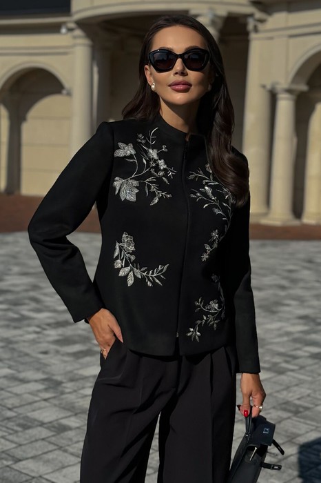 Этот изысканный жакет из искусственной замши – воплощение элегантности и современного стиля. Глубокий черный цвет ткани выгодно подчеркивает изящную вышивку с серебристыми цветочными мотивами, которая добавляет образу нотки роскоши и утонченности. Лаконичный крой с воротником-стойкой создает идеальный баланс между строгостью и женственностью, делая модель универсальной для любых случаев – от деловых встреч до вечерних мероприятий. Жакет подчеркивает статусность и безупречный вкус, прекрасно сочетаясь как с классическими брюками, так и с элегантной юбкой или платьем. Это выбор для тех, кто ценит стиль и комфорт в каждой детали.