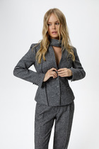 Жакет прямой. Застежка на петли и пуговицы. Воротник пиджачный. На переде накладные карманы. На верхнем кармане выполнена вышивка. По спинке шлица. Рукав прямой со шлицей понизу. Жакет на хлопковой подкладке.