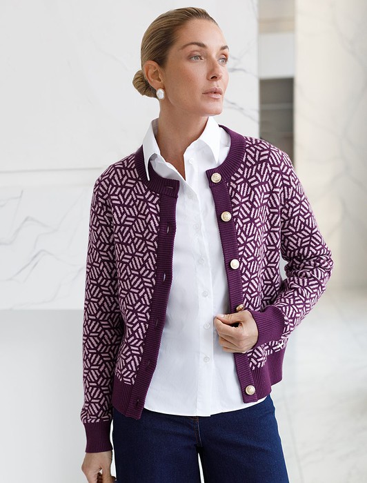 Состав: 50%Вис 20%ПА 20%ПЭ 10%Кашемир Плотность: 12 GG Параметры модели на первом фото: Рост 170, бюст 83, талия 64, бедра 88Жакет пурпурного цвета жаккардовой вязки выполнен из нежной пряжи на основе вискозы с добавлением кашемира. Модель с круглым вырезом и золотистой фурнитурой выглядит дорого и роскошно, приятно ощущается на теле и поддерживает комфортный микроклимат. Жаккардовое вязание - это один из самых дорогих способов изготовления трикотажных изделий, так как для вязания используется сразу несколько цветов нитей. Жаккард вяжется намного дольше, чем однотонное полотно, имеет гораздо больший вес и плотность. Благодаря этому трикотаж дольше сохраняет красивый внешний вид, не пилингуется и не подвержен спуску петель.