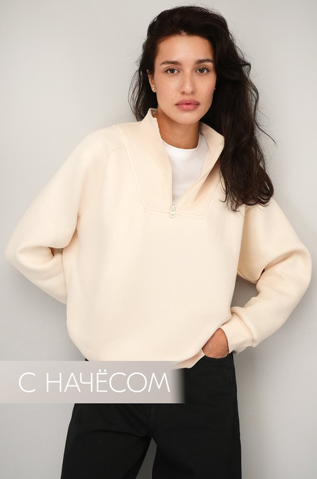 — молочный свитшот с полузамком на молнии защищает от ветра и добавляет стильный акцент;