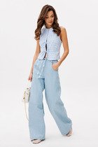 Женские модные джинсы с пятью карманами. Посадка Baggy fit , высокая талия спереди и сзади, широкие штанины по всей длине. для лучшего облегания в области бедер под передними карманами сделана вытачка. Застежка на молнии. Выполнены из эластичной ткани denim stretch, цвет ткани Blue/Black(лицевая сторона ткани темно-синяя, изнаночная сторона-черная). Классическая темная стирка с потёртостями только по швам.