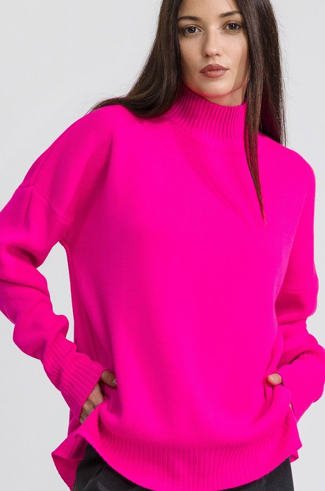 Длинный джемпер с горлом отлично впишется в повседневные осенние или зимние образы. Однотонный свитер яркого малинового цвета для женщин отлично подходит для прогулок осенью, для повседневных образов в офис.
