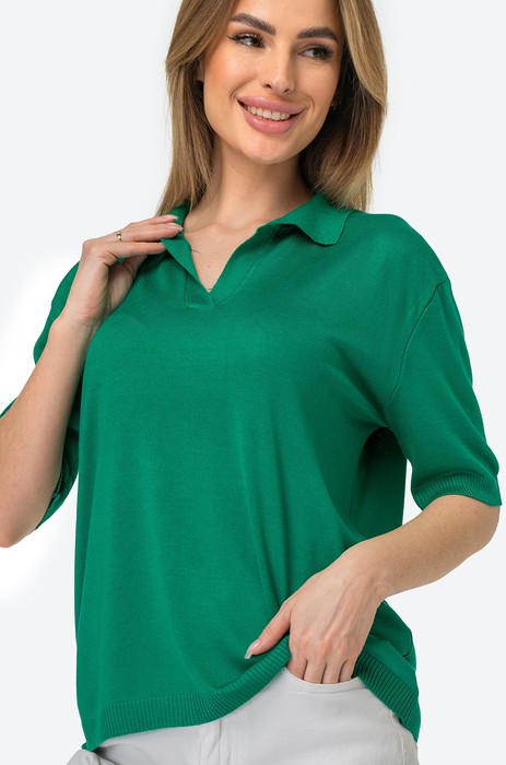 Женская футболка-поло выполнена из нежного вязаного трикотажа. Модель поможет создать крутой кэжуал образ для весны. Зеленая футболка для женщин приковывает взгляды благодаря эффектному сочетанию волнующего V-образного выреза и лаконичного отложного воротника!
